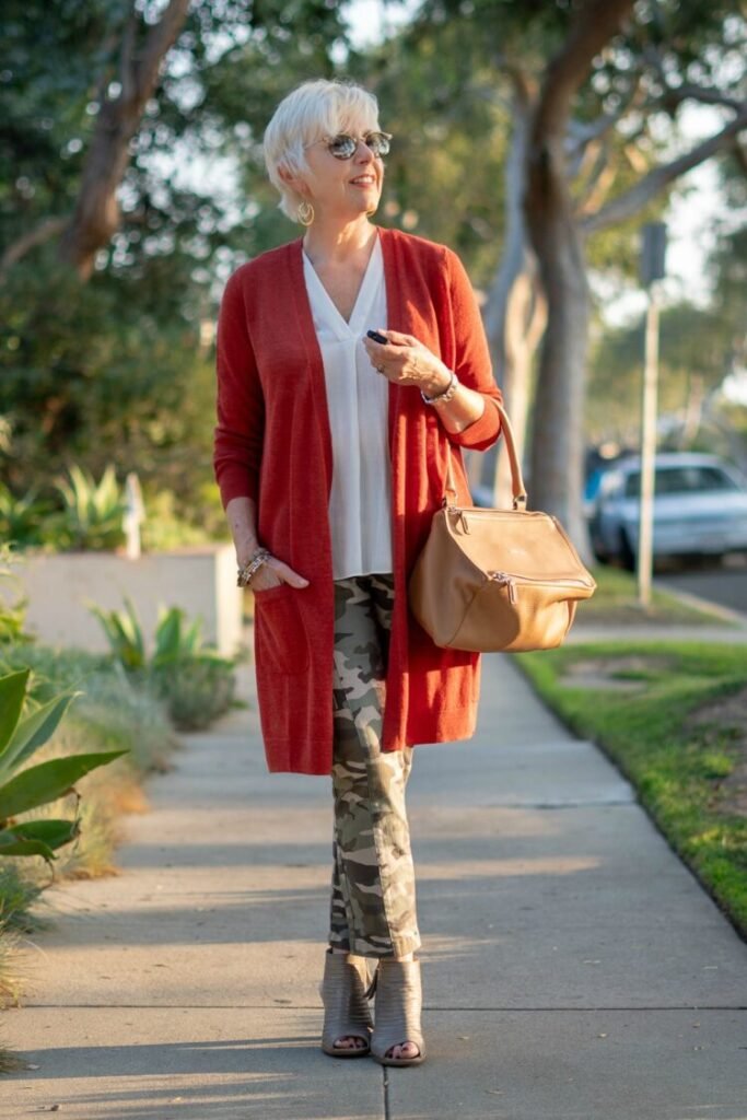 - For slimmer camo pants, you can wear longer layering pieces like jackets or cardigans.